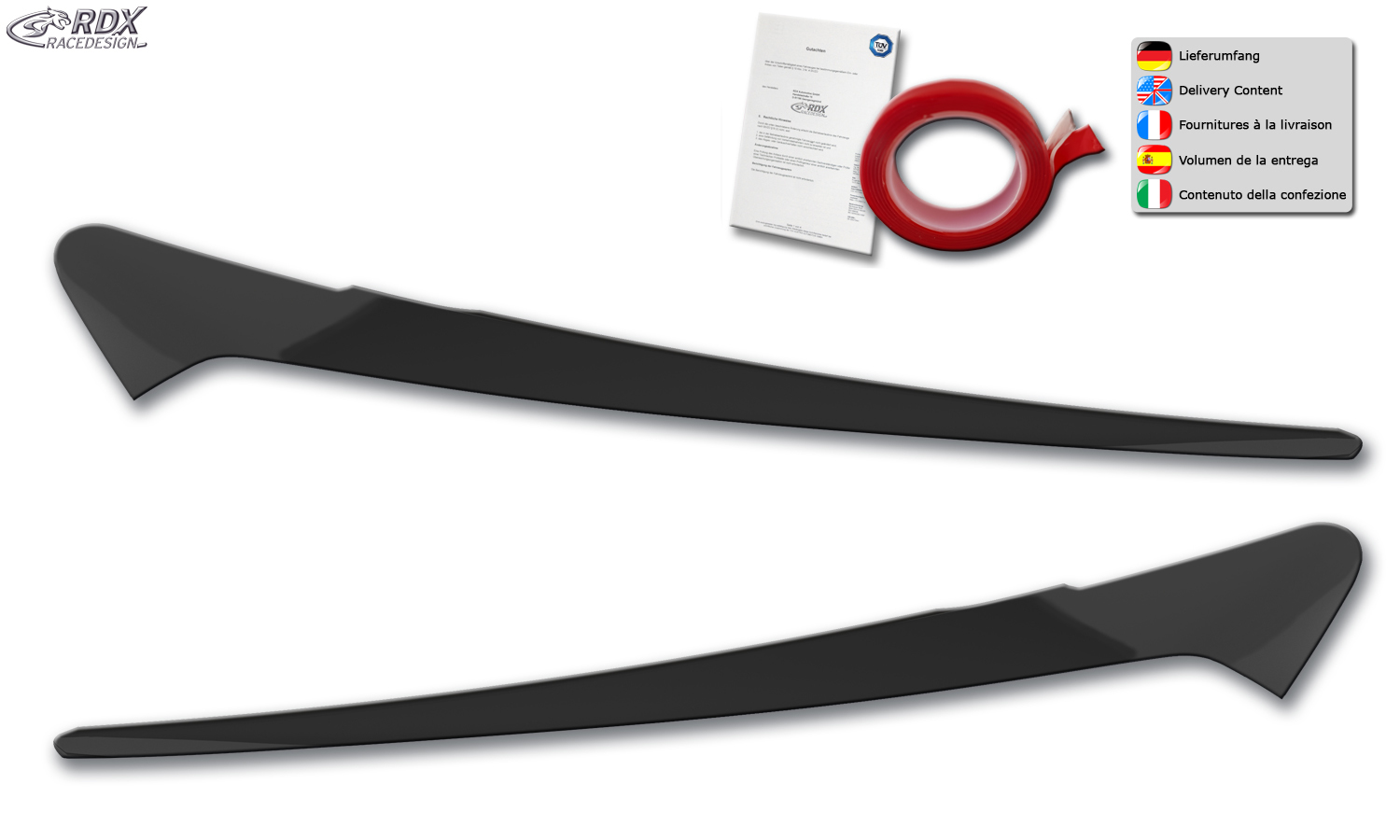Die RDX Scheinwerferblenden im Stil „Böser Blick“ verleihen dem Fahrzeug eine markante, sportliche Frontoptik. Durch die präzise Passform und die einfache Montage per beiliegendem Klebeband lassen sich die Blenden in wenigen Minuten anbringen – ohne Bohren oder spezielle Werkzeuge. Hergestellt aus hochwertigem, flexiblem PUR/ABS-Kunststoff, sind die Blenden besonders robust, bruch- und splitterfest. Die Oberfläche wird unlackiert in schwarzer Kunststoff-Naturfarbe geliefert und kann individuell lackiert werden. Die Scheinwerferblenden sind TÜV-frei und verfügen über eine entsprechende Freigabe – somit entfällt eine Eintragung in die Fahrzeugpapiere.