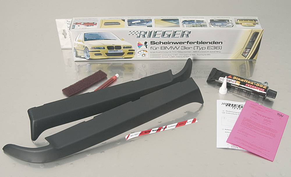 Die Rieger Scheinwerferblenden passend für BMW 3er E36 Coupé und Cabrio verleihen der Fahrzeugfront einen sportlicheren, individuellen Look. Gefertigt aus hochwertigem ABS-Kunststoff, überzeugen die Blenden durch ihre präzise Passform und hohe Stabilität. Dank des im Lieferumfang enthaltenen Montagezubehörs gelingt die Installation schnell und einfach. Durch das beiliegende Teilegutachten ist eine Eintragung gemäß §19 StVZO möglich. Bitte beachten Sie: Diese Scheinwerferblenden sind nicht geeignet für Xenonscheinwerfer. Artikel aus ABS, PUR, GFK oder ABS/Carbon-Look werden unlackiert geliefert und müssen vor der Montage lackiert werden. Varianten mit schwarz-glänzendem oder schwarz-mattem Finish sind montagefertig und müssen nicht mehr lackiert werden.