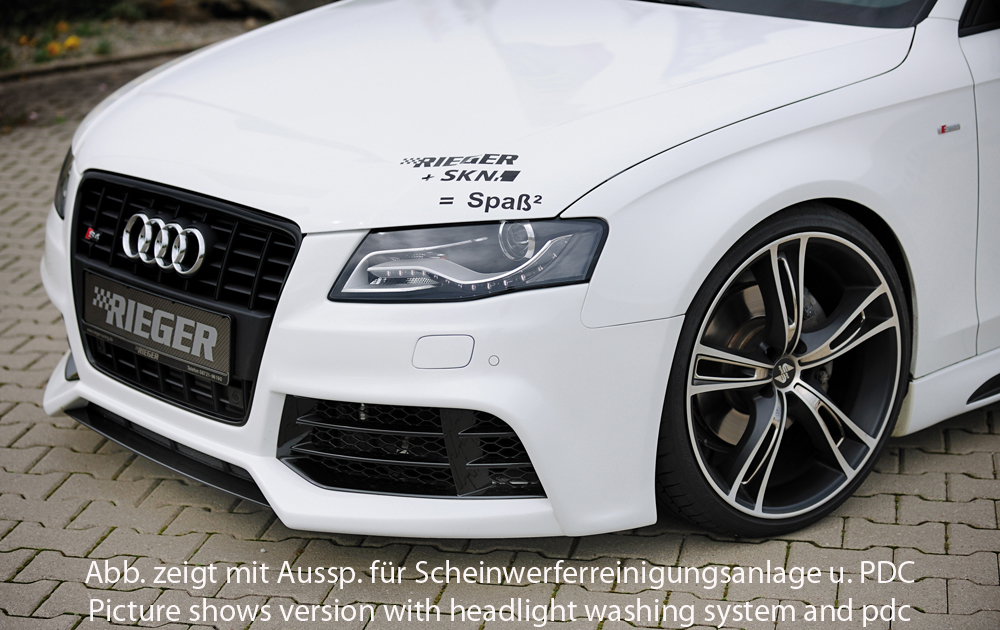 Die Rieger Spoilerstoßstange passend für Audi A4 B8 Limousine (B81) überzeugt durch erstklassige Verarbeitungsqualität und sportlich-dynamisches Design. Gefertigt aus robustem ABS-Material bietet sie eine hohe Passgenauigkeit und Langlebigkeit. Das formschöne Aerodynamik-Element wertet das Fahrzeug optisch auf und sorgt zugleich für verbesserten Abtrieb an der Frontpartie. Die Lieferung erfolgt unlackiert, wodurch Sie die Stoßstange individuell an Ihre Fahrzeugfarbe anpassen können. Dank der mitgelieferten Allgemeinen Betriebserlaubnis (ABE) ist keine zusätzliche Eintragung erforderlich. Auch Fahrzeuge mit oder ohne S-Line Exterieur werden optimal abgedeckt. Beachten Sie, dass die originalen Nebelscheinwerfer bei der Montage entfallen.