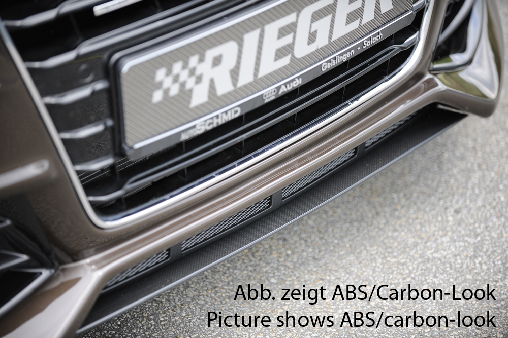 Das hochwertige Rieger Spoilerschwert aus strapazierfähigem ABS-Kunststoff ist speziell passend für Audi A5 S5 (B8/B81) Coupé ab dem Facelift 10/2011–06/2016 entwickelt. Es ergänzt die Rieger Spoilerstoßstange (55460/61/62/63) und sorgt für eine sportlich-aggressive Frontoptik mit verbesserter Aerodynamik. Das Produkt wird inklusive Montagezubehör und ABE geliefert und ist somit eintragungsfrei. Sie erhalten das Spoilerschwert wahlweise in den Oberflächen Carbon Look oder Matt Schwarz. Damit lässt sich die Front Ihres Audi A5 oder S5 perfekt individualisieren. Beachten Sie bitte, dass die ABE ausschließlich bei der Verwendung in Kombination mit originalen Rieger Spoilerstoßstangen gilt. Artikel mit Oberflächen wie ABS/schwarz-glänzend bzw. ABS/schwarz-matt (Finish) sind montagefertig, alle anderen Varianten müssen vor der Endmontage lackiert werden.