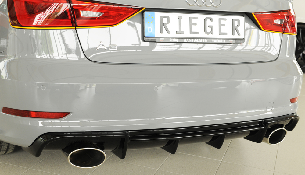 Der hochwertige Rieger Heckeinsatz bietet eine sportlich-elegante Aufwertung des Fahrzeughecks und ist aus widerstandsfähigem ABS gefertigt. Er ist speziell passend für Audi A3 S3 (8V) 3-tür. (Cabrio 8V7) mit S-Line Exterieur im Bauzeitraum von 05/2013 bis 08/2016 (bis Facelift). Der Diffusor ist für Fahrzeuge mit Sportendrohr links und rechts (152x95 mm oval) ausgelegt und wird mit einem passenden Gutachten geliefert, das die Montage eintragungsfrei ermöglicht. Für den individuellen Look stehen verschiedene Oberflächenvarianten zur Auswahl: Glanz Schwarz, Matt Schwarz und Carbon Look. Dadurch lässt sich die Optik perfekt an den gewünschten Stil Ihres Fahrzeugs anpassen. Bitte beachten Sie, dass Teile in den Ausführungen PUR, GFK, ABS bzw. ABS/Carbon-Look unlackiert geliefert werden und vor der Endmontage lackiert werden müssen. Artikel in ABS/schwarz-glänzend oder ABS/schwarz-matt besitzen eine fertige Oberfläche und benötigen keine Lackierung.