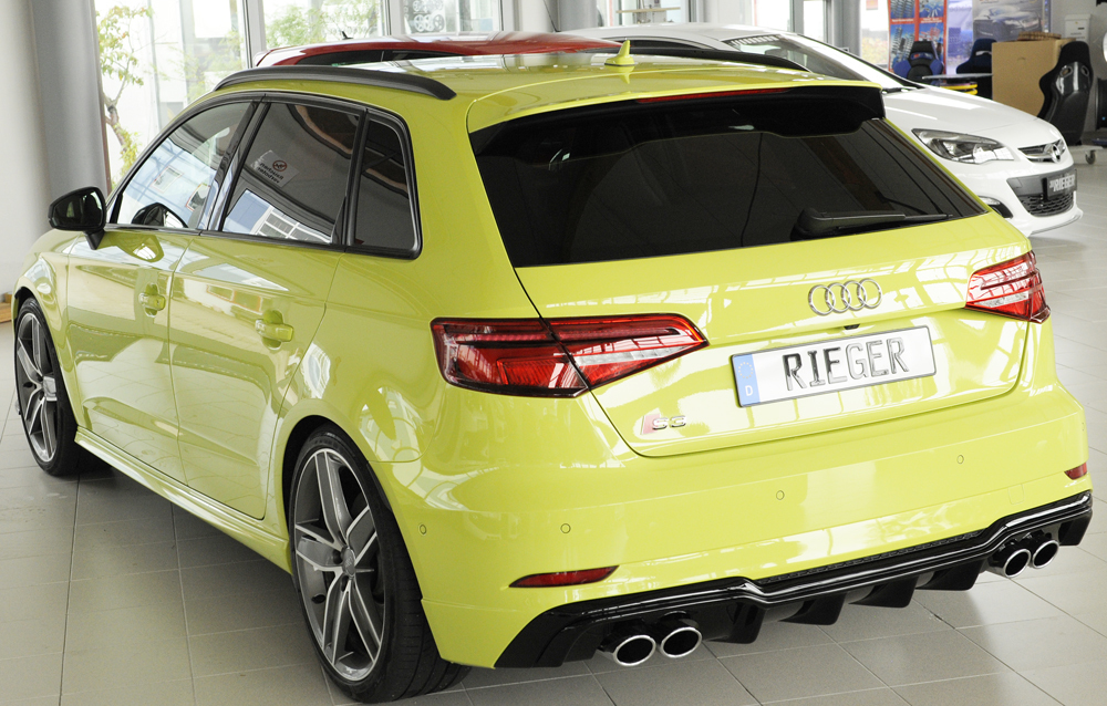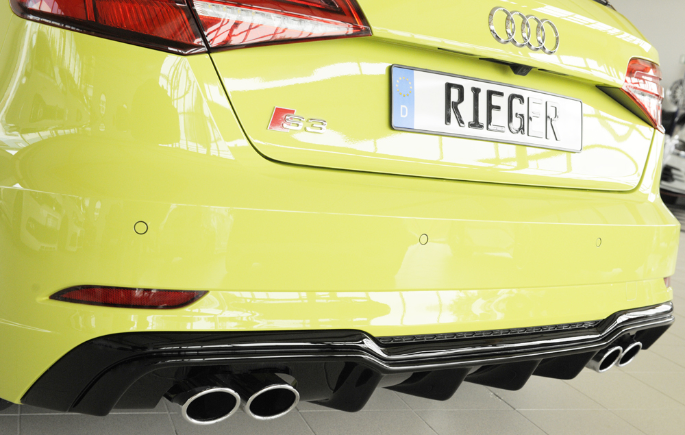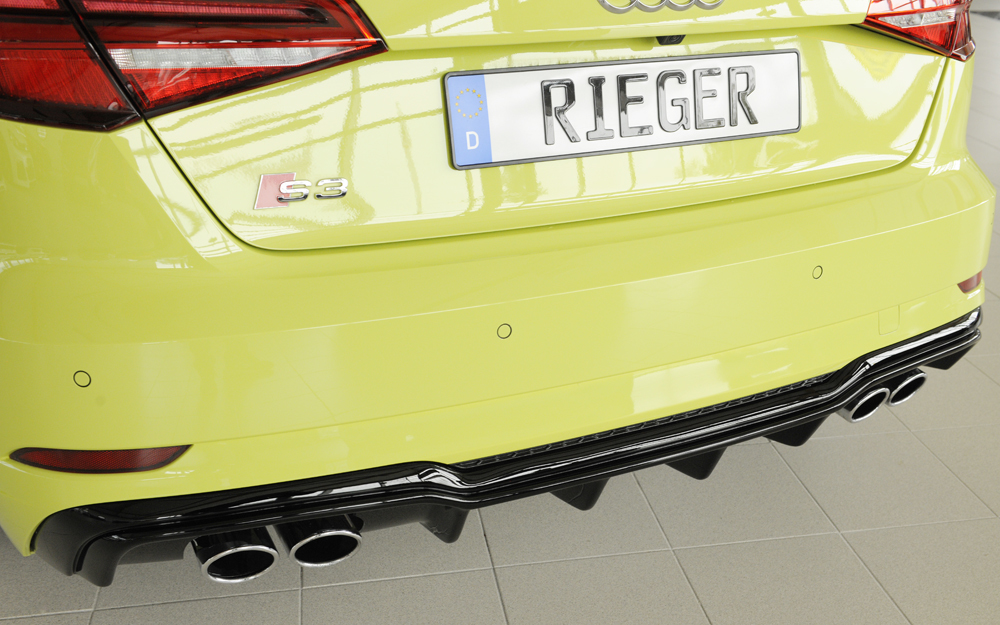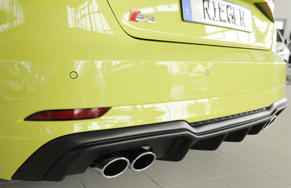 Der hochwertige Rieger Heckeinsatz aus robustem ABS-Material wertet das Heckdesign Ihres Audi A3 S3 (8V) deutlich auf und sorgt für eine sportliche, dynamische Optik. Er ist speziell konstruiert für Fahrzeuge mit S-Line Exterieur und originalem Doppelendrohr links und rechts (4x90x72 mm oval). Dank präziser Passform fügt sich der Heckeinsatz harmonisch in das Fahrzeugdesign ein und unterstreicht den individuellen Look Ihres Sportback-Modells.