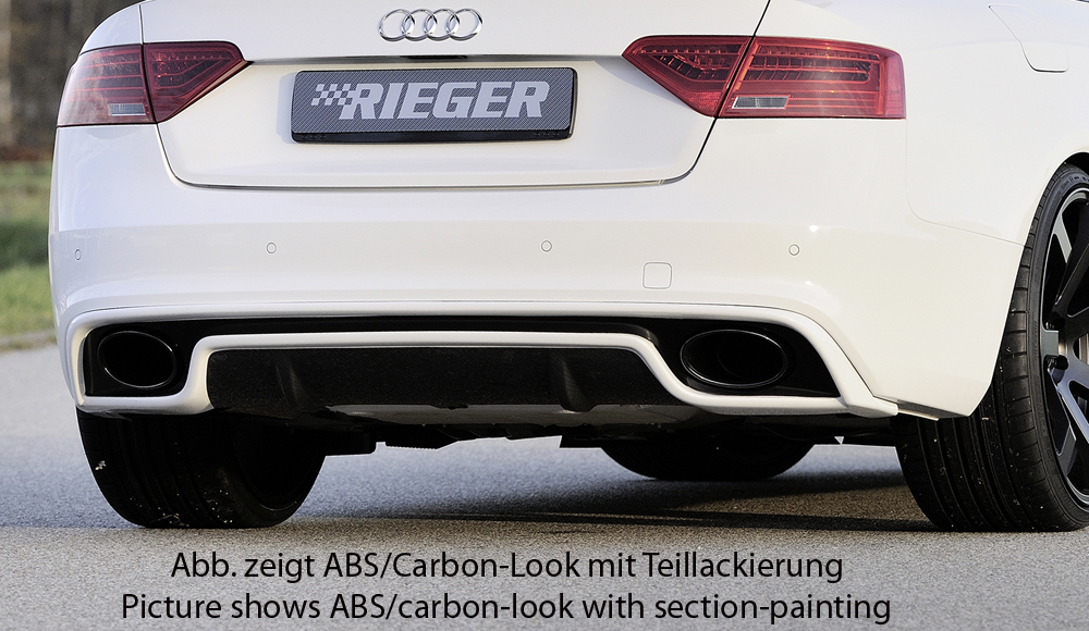 Der hochwertige Rieger Heckeinsatz aus robustem ABS-Material verleiht dem Fahrzeugheck eine sportlich-markante Optik und sorgt für eine perfekte Passform. Dieses aerodynamische Tuningelement wurde speziell passend für Audi A5 S5 (B8/B81) Cabrio entwickelt. Je nach gewünschtem Look ist der Heckeinsatz in den Varianten Carbon Look, Matt Schwarz oder Glanz Schwarz erhältlich. Das Set ist für Fahrzeuge mit S-Line Exterieur ausgelegt und umfasst eine Endrohrblendenaufnahme links und rechts (185x120 mm oval). Das mitgelieferte Gutachten macht eine Eintragung überflüssig, sodass Sie den Heckeinsatz problemlos montieren können. Bitte beachten Sie, dass Teile aus ABS unlackiert geliefert werden, wenn kein spezielles Finish (z. B. ABS/schwarz-glänzend oder ABS/schwarz-matt) gewählt wurde. Eine Lackierung ist in diesem Fall vor der Endmontage erforderlich.