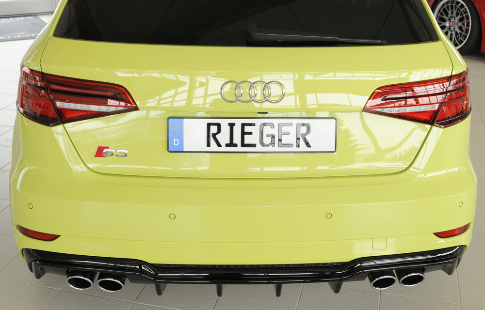 Der Rieger Heckeinsatz passend für Audi A3 S3 (8V) 3-türig (Schrägheck 8V1) ab Baujahr 09/2016 überzeugt durch seine exzellente Passform und sportliche Optik. Gefertigt aus strapazierfähigem ABS-Material, bietet er eine ideale Kombination aus Stabilität und geringem Gewicht. Der Heckeinsatz ist für Fahrzeuge mit originalem Doppelendrohr links und rechts (4x90x72 mm oval) sowie S-Line Exterieur ausgelegt. Erhältlich in den Varianten Matt Schwarz und Glanz Schwarz passt er sich perfekt dem Erscheinungsbild Ihres Fahrzeugs an. Dank mitgeliefertem Gutachten ist der Artikel eintragungsfrei und schnell montiert – das passende Zubehör liegt bereits bei. Artikel in ABS/schwarz-glänzend oder ABS/schwarz-matt besitzen eine fertige Oberfläche und müssen nicht lackiert werden; unlackierte Varianten sollten vor der Endmontage lackiert werden.