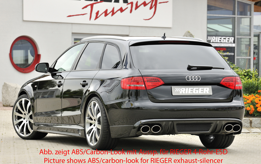 Der hochwertige Rieger Heckschürzenansatz passend für Audi A4 (B8/B81) Avant verleiht Ihrem Fahrzeug eine dynamische und sportliche Optik. Gefertigt aus robustem ABS-Material überzeugt der Ansatz durch hohe Passgenauigkeit, Stabilität und eine lange Lebensdauer. Der Heckschürzenansatz ist für Fahrzeuge mit originalem Doppelendrohr links und ohne S-Line Exterieur ausgelegt. Dank der beiliegenden Montagezubehörteile und dem mitgelieferten Alugitter gelingt die Installation schnell und unkompliziert. Das Bauteil wird unlackiert geliefert und ist daher ideal lackierfähig – optional können Sie es in Wagenfarbe oder Kontrastfarbe lackieren, um Ihrem Audi eine individuelle Note zu verleihen. Das Produkt wird mit einem Gutachten geliefert, ist eintragungsfrei und sorgt für ein Plus an sportlichem Stil, ohne aufwendige Abnahmen.