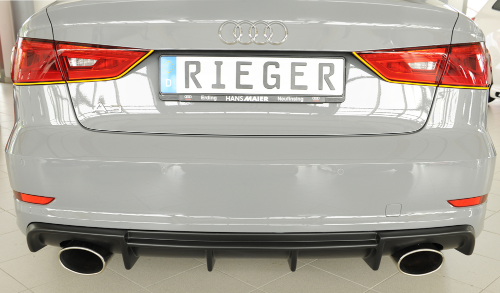 Der hochwertige Rieger Heckeinsatz bietet eine sportlich-elegante Aufwertung des Fahrzeughecks und ist aus widerstandsfähigem ABS gefertigt. Er ist speziell passend für Audi A3 S3 (8V) 3-tür. (Cabrio 8V7) mit S-Line Exterieur im Bauzeitraum von 05/2013 bis 08/2016 (bis Facelift). Der Diffusor ist für Fahrzeuge mit Sportendrohr links und rechts (152x95 mm oval) ausgelegt und wird mit einem passenden Gutachten geliefert, das die Montage eintragungsfrei ermöglicht. Für den individuellen Look stehen verschiedene Oberflächenvarianten zur Auswahl: Glanz Schwarz, Matt Schwarz und Carbon Look. Dadurch lässt sich die Optik perfekt an den gewünschten Stil Ihres Fahrzeugs anpassen. Bitte beachten Sie, dass Teile in den Ausführungen PUR, GFK, ABS bzw. ABS/Carbon-Look unlackiert geliefert werden und vor der Endmontage lackiert werden müssen. Artikel in ABS/schwarz-glänzend oder ABS/schwarz-matt besitzen eine fertige Oberfläche und benötigen keine Lackierung.