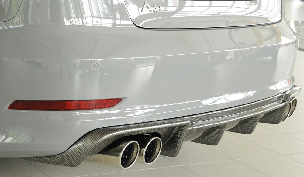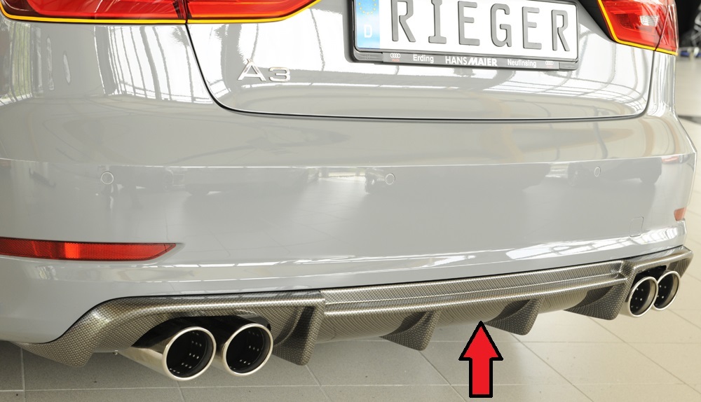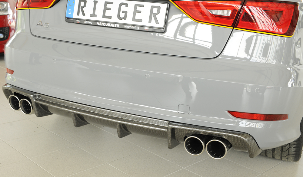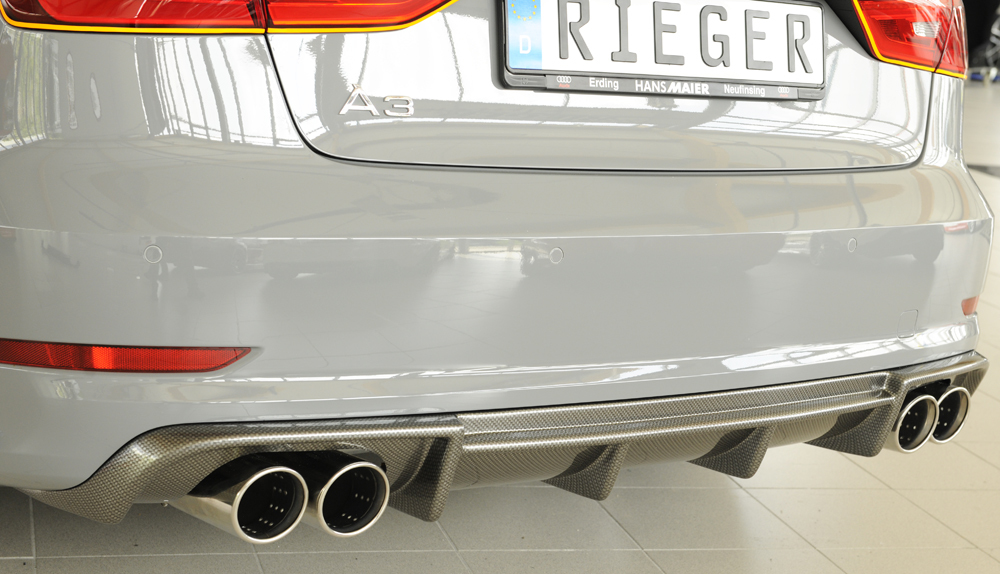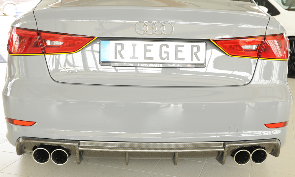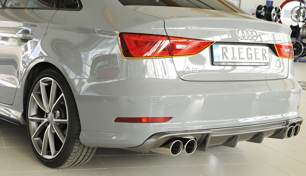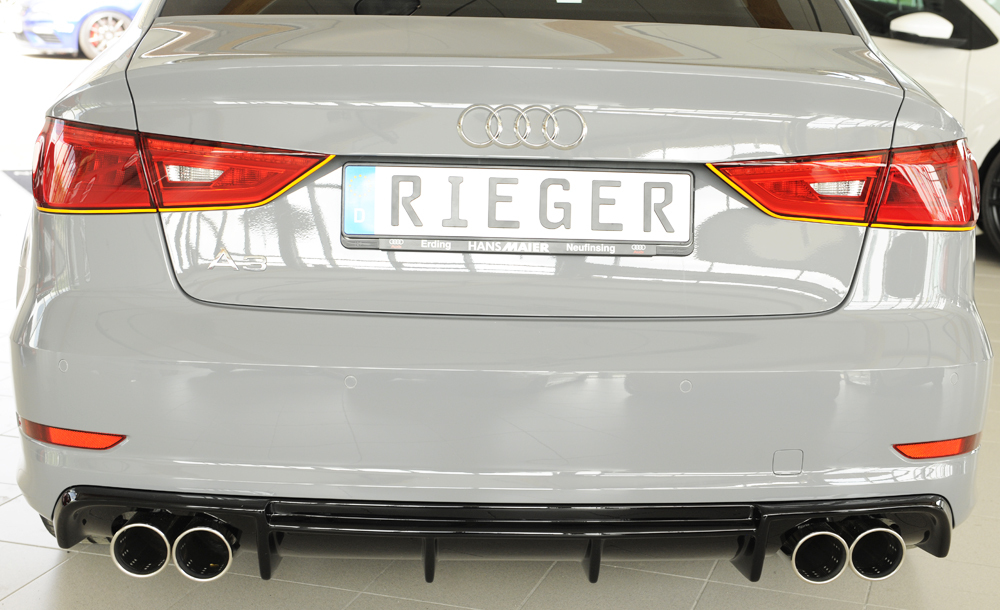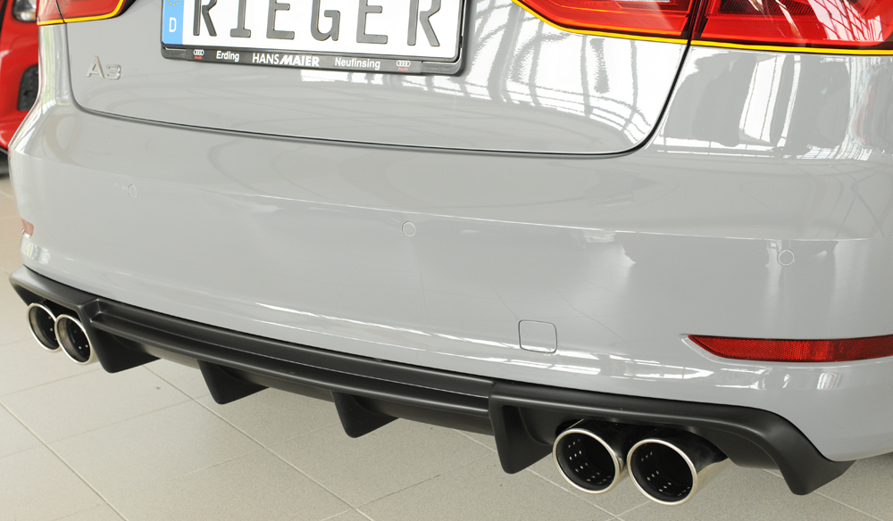 Der hochwertige Rieger Heckeinsatz aus ABS Kunststoff überzeugt durch optimale Passgenauigkeit und sportliches Design. Entwickelt speziell für den Einsatz an der Audi A3 (8V) Limousine verleiht dieser Heckeinsatz Ihrem Fahrzeug eine markante und individuelle Heckansicht. Das aerodynamische Design sorgt nicht nur für eine sportliche Optik, sondern verbessert auch die Luftführung am Heck.