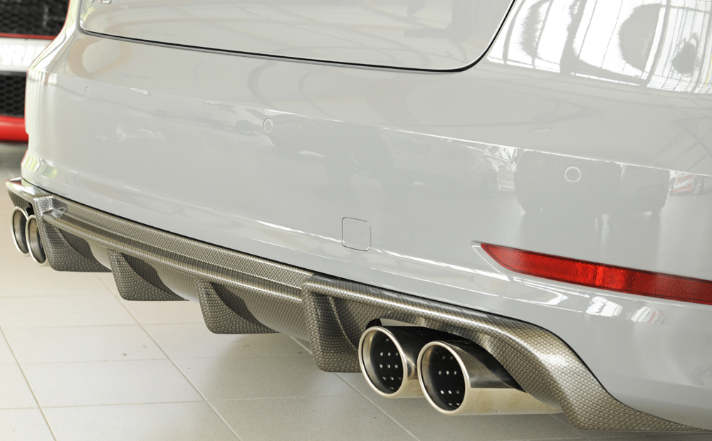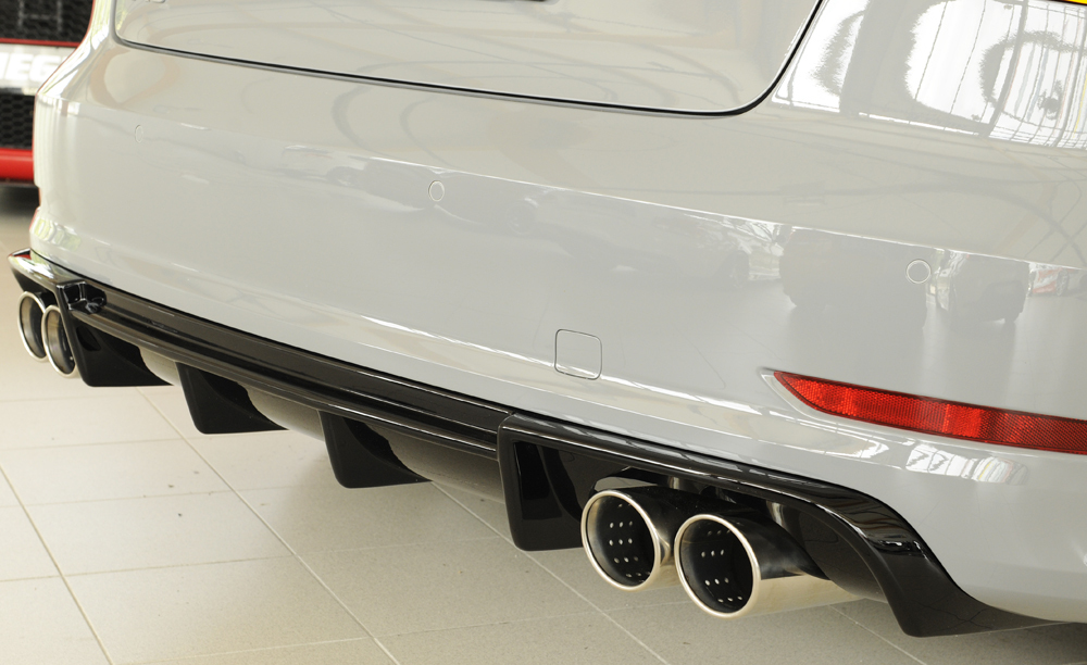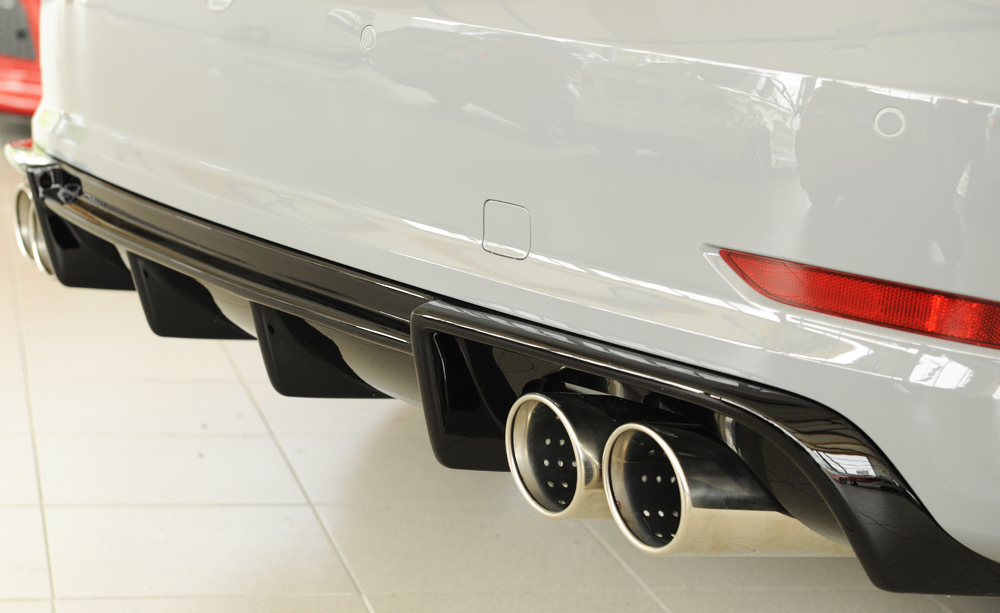 Dieser Heckeinsatz ist für Fahrzeuge mit Doppelendrohr links und rechts (4x90 mm Ø) und S-Line Exterieur konzipiert. Er wird inklusive Montagezubehör und Gutachten geliefert und ist somit montagefertig.