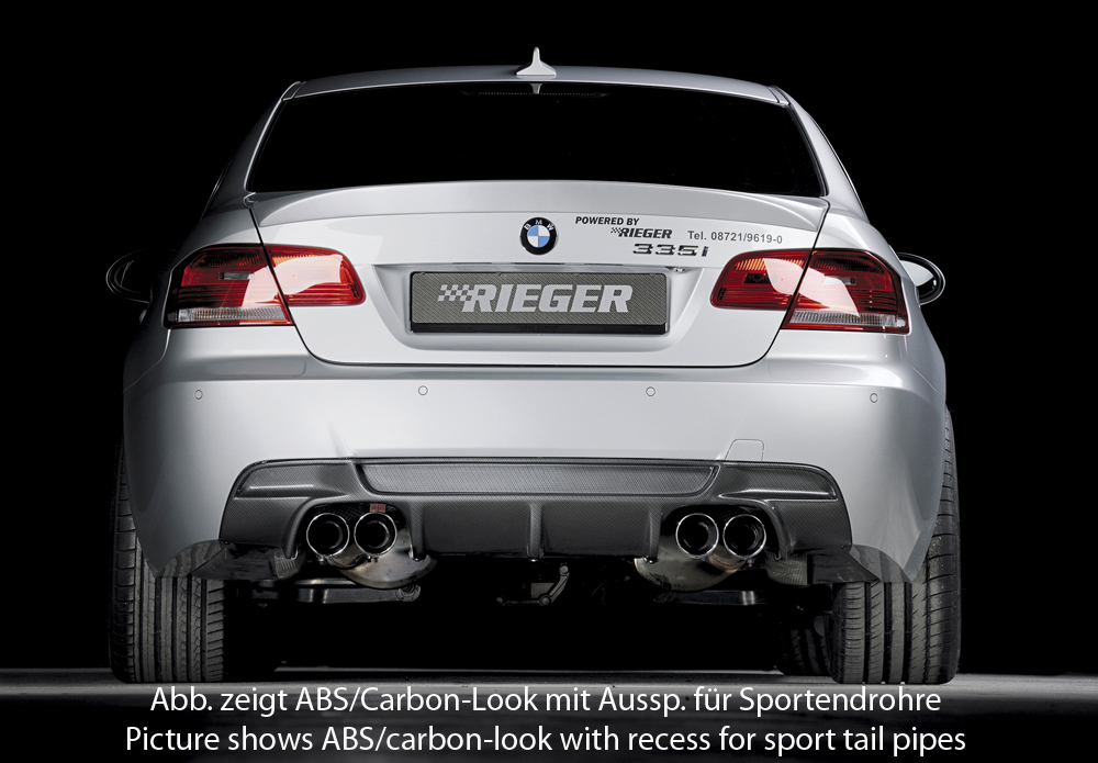 Der Rieger Heckeinsatz Carbon Look oder Matt Schwarz verleiht Ihrem Fahrzeugheck ein sportliches und dynamisches Erscheinungsbild. Gefertigt aus hochwertigem ABS-Material überzeugt dieser Heckansatz durch Stabilität und eine passgenaue Formgebung – ideal für alle, die Wert auf Qualität und Design legen. Der Heckeinsatz ist speziell passend für BMW 3er E92 Coupé (ab Facelift 03/2010) mit M-Technik-Heckschürze. Dank des mitgelieferten Gutachtens ist keine Eintragung notwendig. Die Oberfläche in Carbon Look oder Matt Schwarz fügt sich harmonisch in das Gesamtbild des Fahrzeugs ein und betont die sportliche Linienführung. Bitte beachten Sie, dass unlackierte Varianten vor der Endmontage lackiert werden müssen.