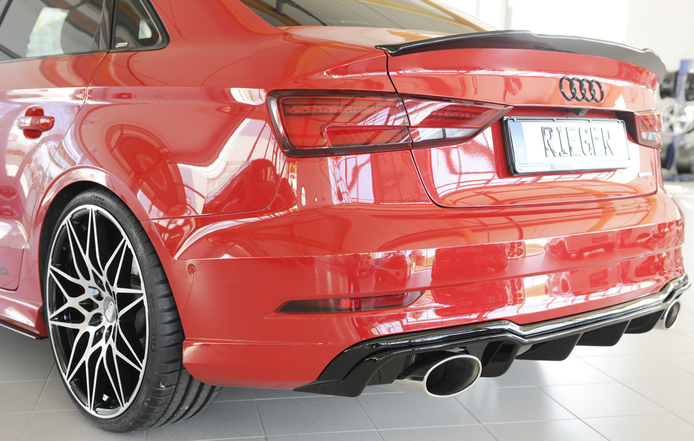 Der Rieger Heckeinsatz passend für Audi A3 (8V) Limousine 8VS ab 09/2016 verleiht dem Fahrzeugheck eine sportliche und exklusive Optik. Gefertigt aus hochwertigem ABS-Material überzeugt dieser Heckansatz durch Formstabilität und Langlebigkeit. Der Heckeinsatz wird inklusive Montagezubehör und Gutachten geliefert, wodurch keine zusätzliche Eintragung erforderlich ist. Für Fahrzeuge mit S-Line Exterieur entwickelt, ermöglicht er die Montage von Sportendrohren links und rechts (152 x 95 mm oval). Sie können zwischen den attraktiven Oberflächen Glanz Schwarz, Carbon Look und Matt Schwarz wählen, um das Design optimal an Ihr Fahrzeug anzupassen. Bitte beachten Sie, dass unlackierte Versionen vor der Endmontage lackiert werden müssen.