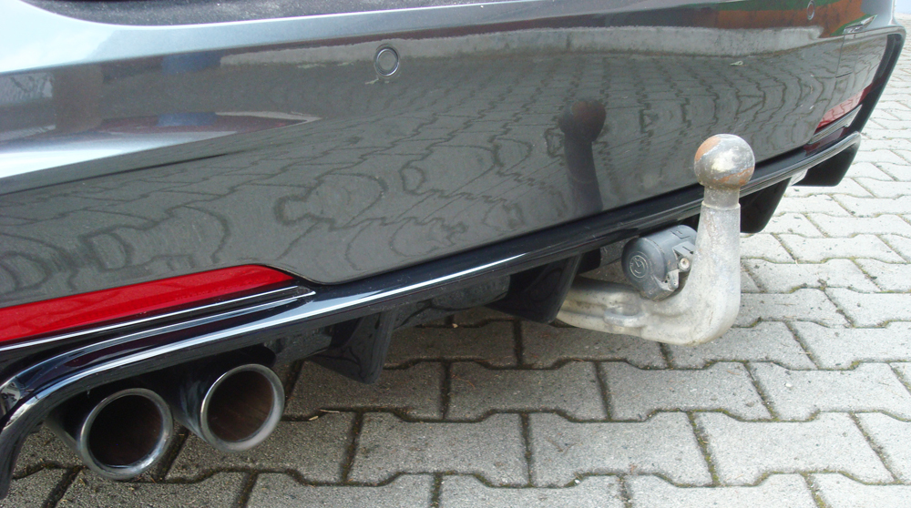 Hinweis: Passt auch bei Fahrzeugen mit originalem Endrohr 1x links (120x65mm). Bei Fahrzeugen mit Anhängerkupplung muss die Aussparung im Heckeinsatz selbst ausgeschnitten werden (siehe Montageanleitung).
