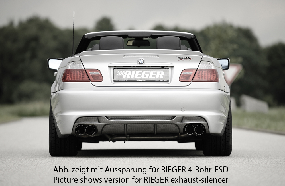 Der hochwertige Rieger Heckeinsatz aus strapazierfähigem ABS-Material ist die ideale Tuning-Ergänzung passend für BMW 3er E46 Limousine ab 02/2002. Er sorgt für eine sportliche Heckansicht und eine klare Linienführung, die das Fahrzeug optisch aufwertet. Der Einsatz ist für die Montage an der Heckschürze 50248/49/50/51 vorgesehen und wird inklusive Gutachten sowie Montagezubehör geliefert.