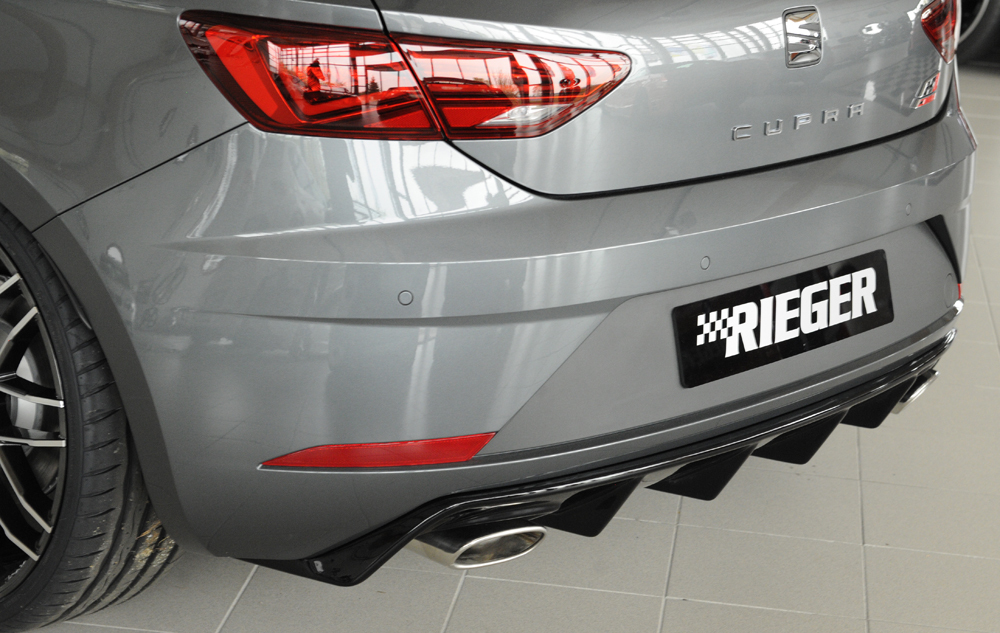 Der hochwertige Rieger Heckeinsatz aus strapazierfähigem ABS-Material bietet eine sportliche und dynamische Optik für Ihren Seat Leon Cupra (5F) ab Baujahr 01/2017. Dieses passgenaue Aerodynamik-Bauteil wurde speziell für das original Endrohr links und rechts entwickelt und überzeugt durch präzise Verarbeitung und langlebige Qualität. Der Heckeinsatz ist in den Varianten Glanz Schwarz und Matt Schwarz erhältlich, sodass Sie das Design perfekt auf den Stil Ihres Fahrzeugs abstimmen können. Eine Lackierung ist bei der schwarz-glänzenden bzw. schwarz-matten Finish-Oberfläche nicht erforderlich. Für Versionen in PUR, GFK, ABS oder ABS/Carbon-Look ist eine Lackierung vor der Endmontage empfohlen.