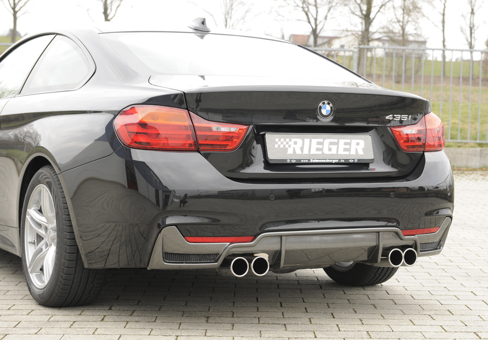 Der Rieger Heckeinsatz aus hochwertigem ABS-Material bietet eine sportliche und exklusive Optik für Ihr BMW 4er Coupé F32 LCI mit M-Paket-Heckschürze. Das Design mit seitlichen Gittereinsätzen und Aussparungen für Doppelendrohre (4x80 mm Ø) unterstreicht die Performance Ihres Fahrzeugs eindrucksvoll. Sie können zwischen den Oberflächen Glanz Schwarz und Matt Schwarz wählen, um die Optik perfekt an Ihr Fahrzeug abzustimmen. Der Heckeinsatz ist eintragungsfrei und wird inklusive Alugitter, Montagezubehör sowie Gutachten geliefert. Dank der präzisen Passform für Fahrzeuge mit M-Technik gestaltet sich die Montage einfach und passgenau. Bitte beachten Sie, dass Varianten aus PUR, GFK, ABS oder ABS/Carbon-Look unlackiert geliefert werden und vor der Endmontage lackiert werden müssen. Varianten in ABS/schwarz-glänzend bzw. ABS/schwarz-matt verfügen über eine hochwertige Finish-Oberfläche und benötigen keine Lackierung.