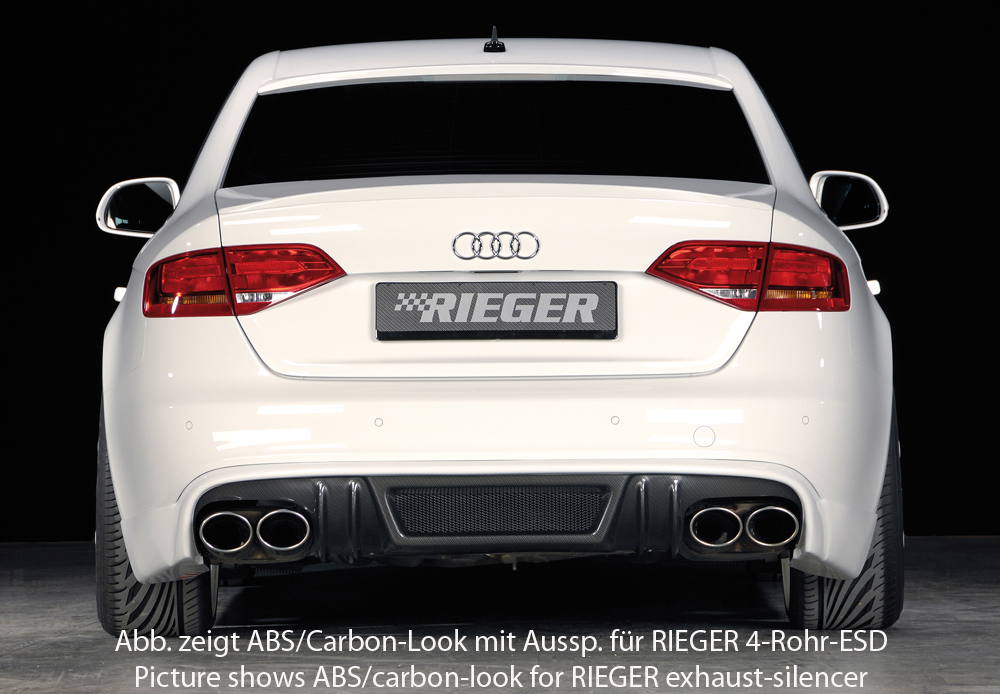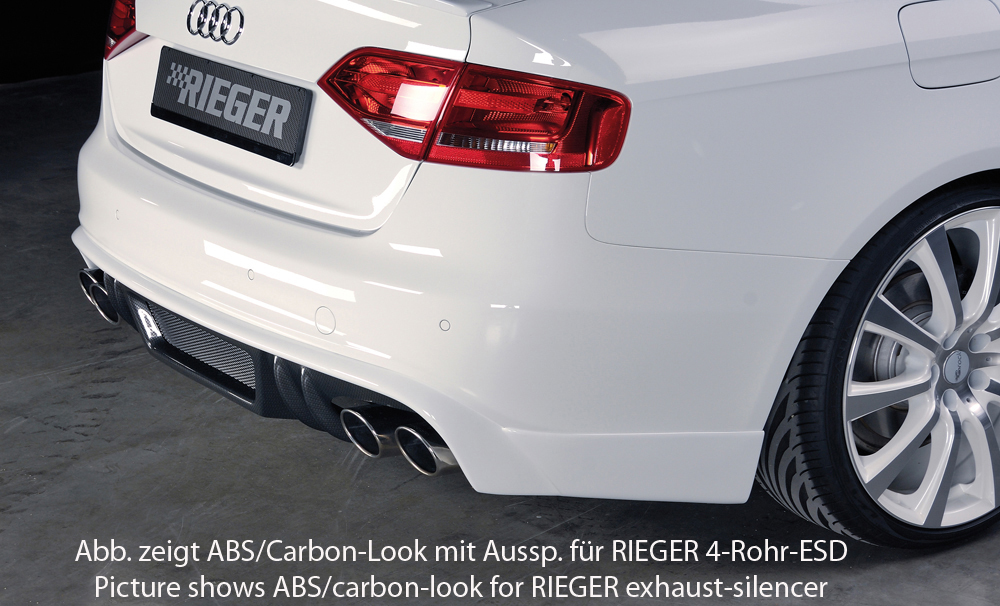Der Rieger Heckschürzenansatz bietet eine sportlich-elegante Aufwertung des Fahrzeughecks und ist passgenau für Audi A4 S4 (B8/B81) Limousine 11/2008–12/2011 gefertigt. Die hochwertige Herstellung aus robustem ABS-Material sorgt für Langlebigkeit und eine perfekte Passform. Dank des mitgelieferten Alugitters und Zubehörs ist eine einfache Montage gewährleistet. Das Design integriert harmonisch die originalen Doppelendrohre links und rechts sowie das S-Line Exterieur. Ein Gutachten wird mitgeliefert, wodurch keine zusätzliche Eintragung notwendig ist.