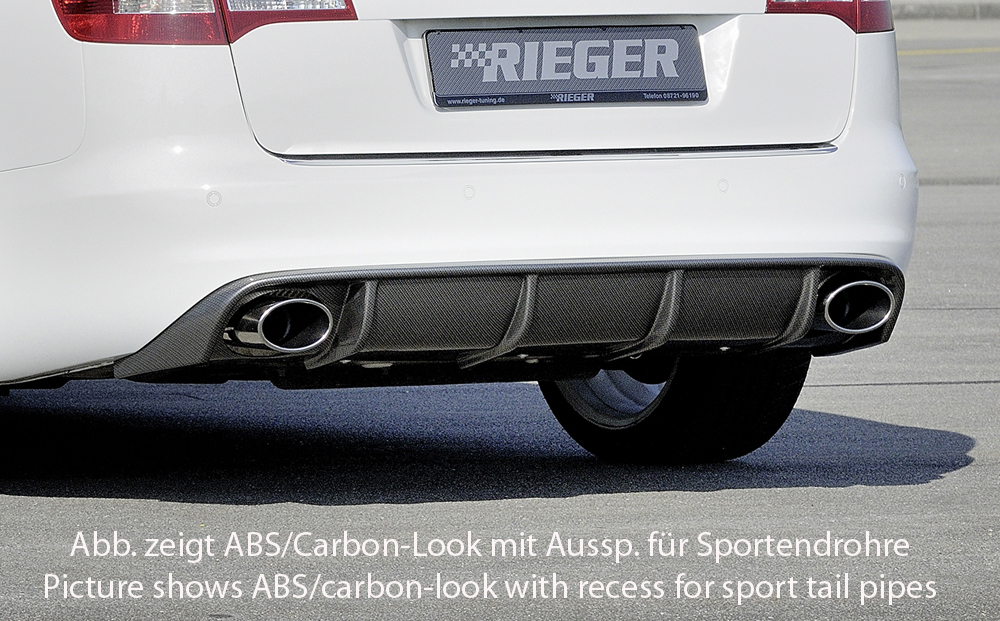 Der hochwertige Rieger Heckeinsatz verleiht dem Audi A6 (4F) Avant ab Facelift 10/2008 bis 08/2011 eine sportlich-elegante Optik und betont das Heckdesign. Gefertigt aus robustem ABS-Material überzeugt der Heckeinsatz durch Langlebigkeit und perfekte Passform. Er ist speziell für Fahrzeuge ohne S-Line Exterieur entwickelt und wird inklusive Montagezubehör und Gutachten geliefert.