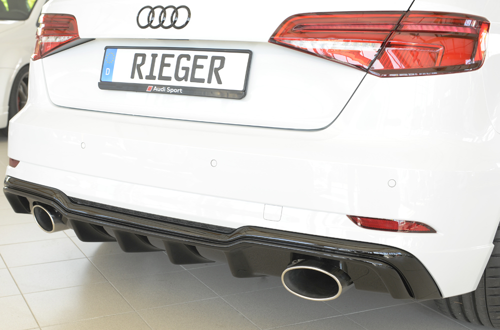 Der hochwertige Rieger Heckeinsatz bietet eine sportliche Aufwertung des Fahrzeughecks und ist ideal passend für Audi A3 S3 (8V) 3-türig (Schrägheck 8V1) ab Facelift 09/2016. Gefertigt aus robustem ABS-Kunststoff überzeugt er durch exakte Passform und Langlebigkeit. Der Heckeinsatz ist für Modelle mit S-Line Exterieur gestaltet und für Sportendrohre links und rechts (152 x 95 mm oval) ausgelegt.