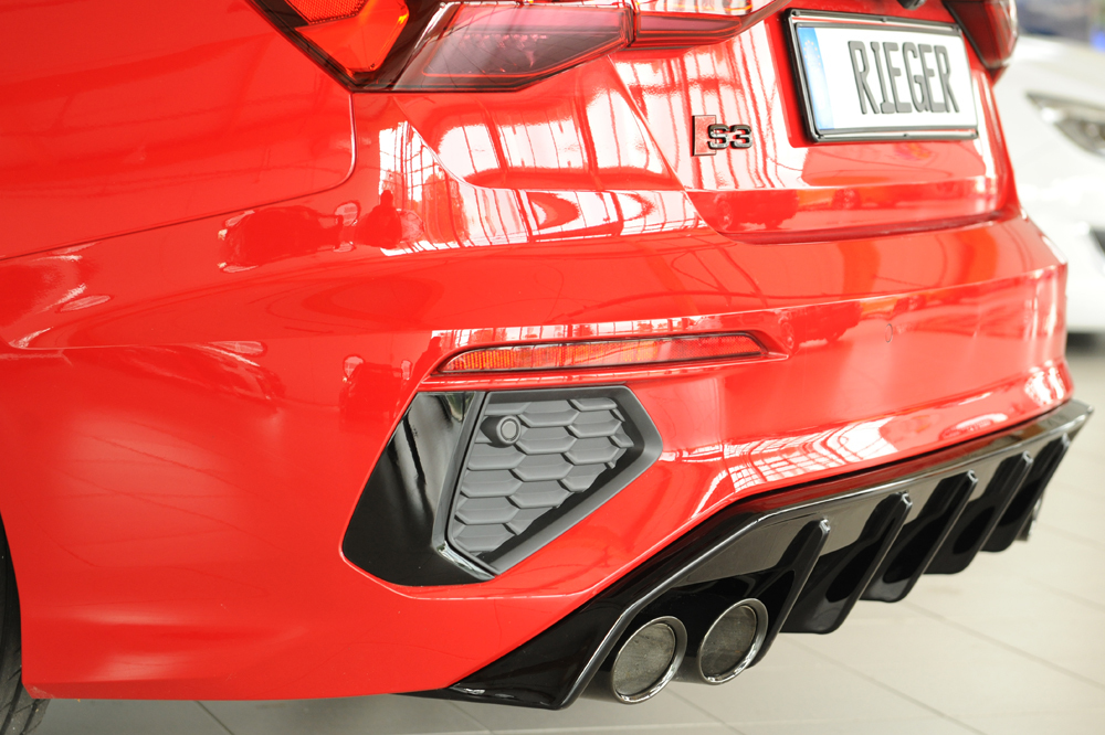 Der Rieger Heckeinsatz ist die ideale Lösung, wenn Sie das Heck Ihres Audi A3 (GY) Sportback optisch aufwerten und gleichzeitig sportlicher gestalten möchten. Gefertigt aus hochwertigem ABS-Kunststoff verbindet der Einsatz Langlebigkeit mit perfekter Passform. Die Variante Unlackiert ist bereit für eine individuelle Lackierung, während die Variante Glanz Schwarz eine edle Hochglanz-Oberfläche besitzt, die sofort montagefertig ist. Der Heckeinsatz verfügt über Aussparungen für Doppelendrohre links und rechts (4x100x81mm oval) und ist speziell für Fahrzeuge mit S-Line Exterieur ausgelegt. Dank beiliegendem Gutachten ist keine Eintragung erforderlich, wodurch Sie eine einfache und rechtssichere Montage genießen. Dieses hochwertige Aerodynamik-Bauteil sorgt für einen markanten Heckabschluss und ergänzt das Design Ihres Fahrzeugs optimal.