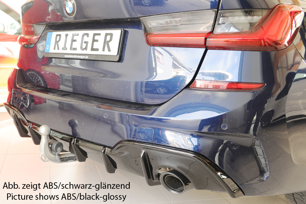 Der Rieger Heckeinsatz aus hochwertigem ABS-Material wurde speziell passend für den BMW 3er G21 Touring entwickelt und überzeugt durch eine sportliche Optik und präzise Passform. Dieser Einsatz ist für Fahrzeuge mit Anhängekupplung (AHK) und M-Sport-Paket-Heckschürze ausgelegt und ermöglicht eine einfache Montage an den originalen Befestigungspunkten. Das Material ABS bietet hohe Stabilität und Witterungsbeständigkeit. Sie können zwischen den Oberflächenvarianten Glanz Schwarz und Matt Schwarz wählen, um den Look Ihres Fahrzeugs perfekt abzustimmen. Der Heckeinsatz verfügt über Aussparungen für die originalen Endrohre (90 mm Ø) und wird inklusive Montagezubehör sowie Gutachten geliefert. Da eintragungsfrei, ist keine separate Abnahme erforderlich.