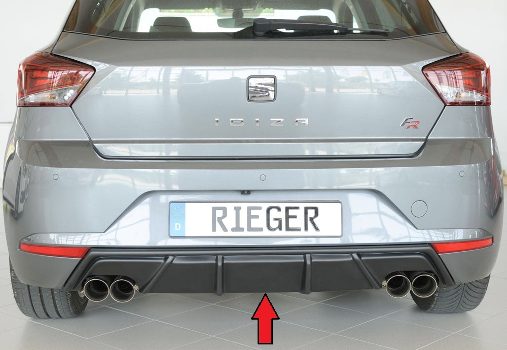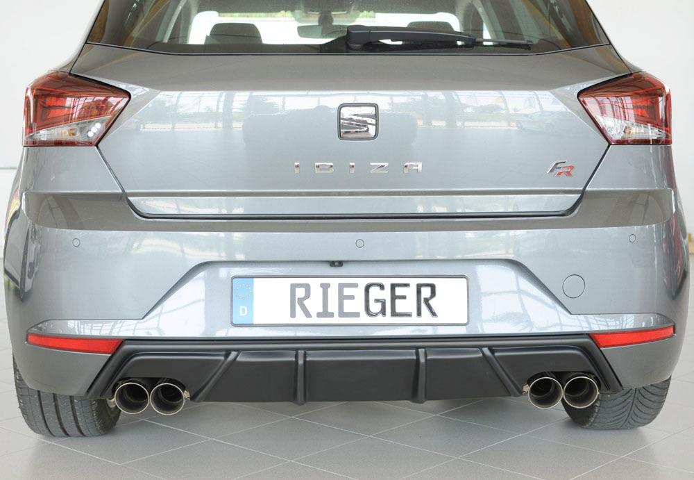 Der hochwertige Rieger Heckeinsatz passt perfekt für den Seat Ibiza FR (KJ) ab Baujahr 01/2017 und verleiht dem Fahrzeug ein sportlich markantes Design. Gefertigt aus robustem ABS überzeugt der Einsatz durch sein geringes Gewicht, exakte Passform und Langlebigkeit. Die integrierte Endrohraussparung ist speziell für Fahrzeuge mit Sport-Endschalldämpfer links/rechts und Doppelendrohr (4x80 mm Ø) konzipiert. Der Heckeinsatz wird inklusive Gutachten geliefert, wodurch keine Eintragung erforderlich ist. Dank der mitgelieferten Montagezubehörteile wird die Installation erleichtert. Bitte beachten Sie, dass der Heckeinsatz unlackiert geliefert wird und vor der Endmontage lackiert werden sollte – eine glänzende oder matte Oberfläche ist je nach Ausführung verfügbar.