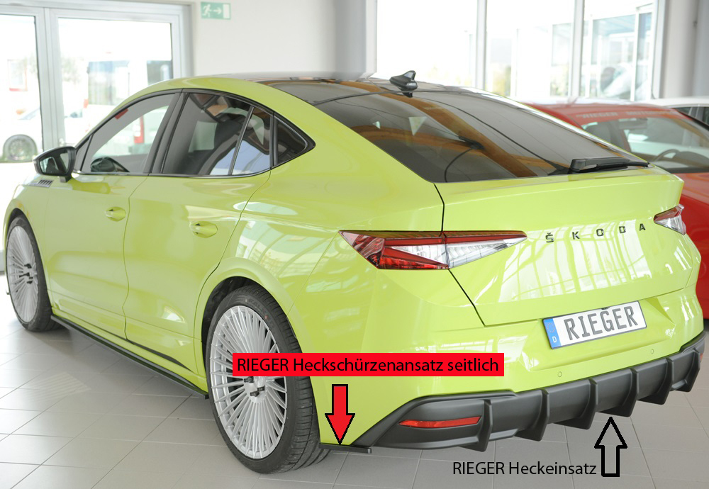 Der hochwertige Rieger Heckschürzenansatz seitlich links wurde speziell passend für Skoda Enyaq iV (NY) Coupé (5AC) entwickelt. Das Teil besteht aus robustem und passgenau verarbeitetem ABS-Material und bietet eine sportliche Aufwertung der Heckansicht Ihres Fahrzeugs. Der Ansatz ist auf den RIEGER Heckeinsatz abgestimmt und wird inklusive passendem Montagezubehör und Gutachten geliefert.