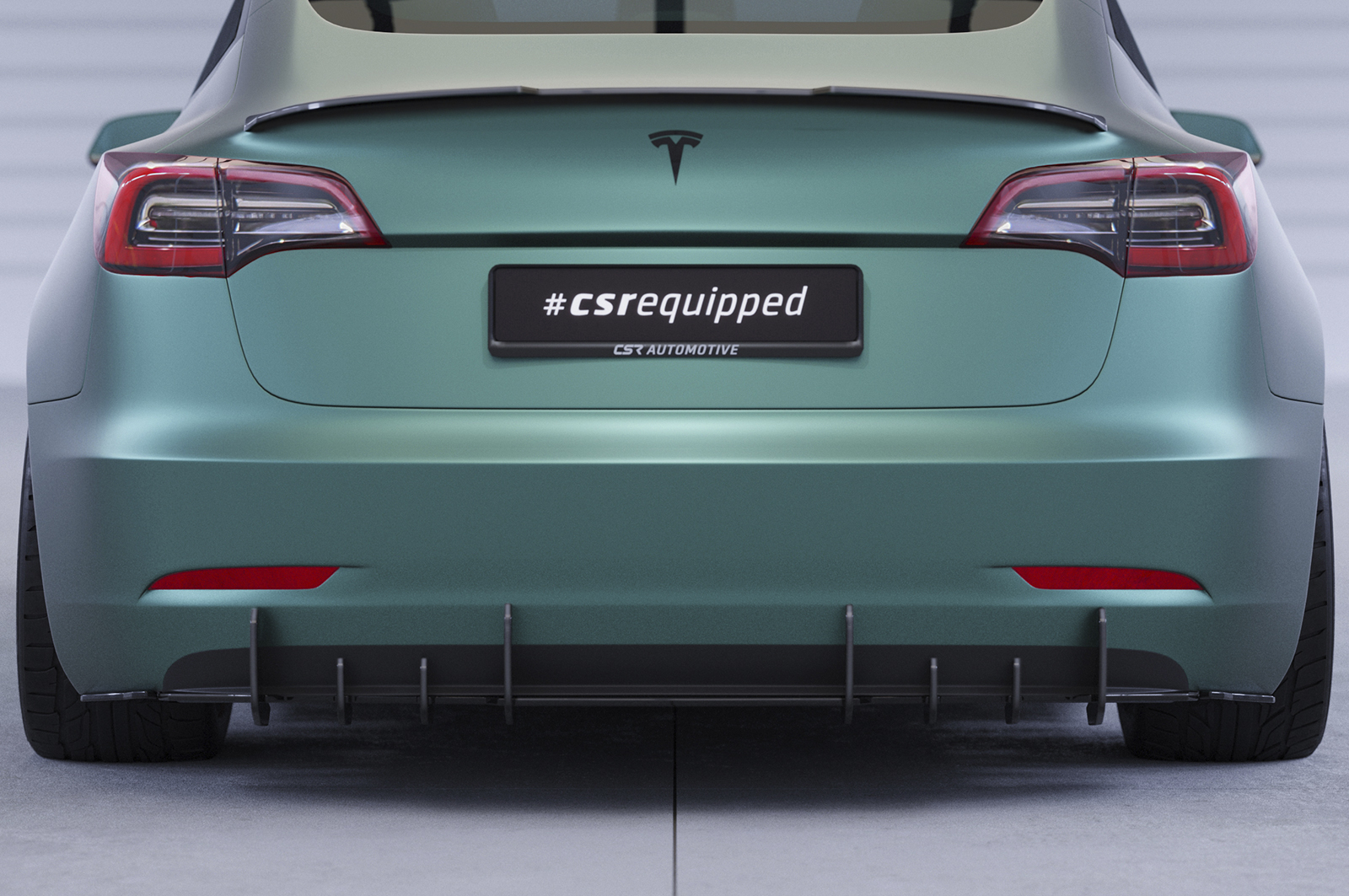 Racing Diffusor / Heckansatz passend für Tesla Model 3 Baujahr 2017–09/2023 (vor Facelift) in allen Modell- und Karosserievarianten.