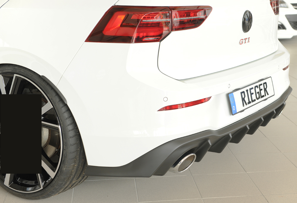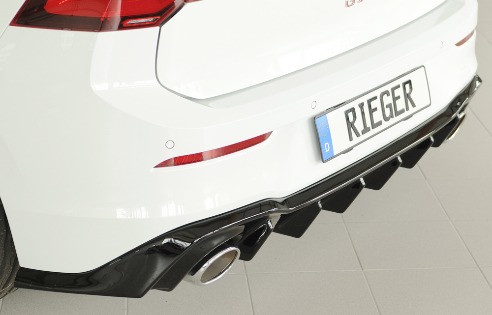Der hochwertige Rieger Heckeinsatz bietet eine sportliche und maßgefertigte Heckgestaltung passend für VW Golf 8 GTI Clubsport 5-türig bis Baujahr 03/2024 (vor Facelift). Gefertigt aus robustem ABS-Material überzeugt der Diffusor durch präzise Passform und langlebige Qualität. Er eignet sich für Fahrzeuge mit originalem Endrohr links und rechts (130x115 mm oval) und wird inklusive Montagezubehör sowie Gutachten geliefert.