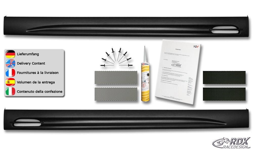Gefertigt aus hochwertigem ABS-Kunststoff in Erstausrüsterqualität sind die Schweller flexibel, bruch- sowie splitterfest und somit ideal für den täglichen Einsatz. Dank der integrierten Befestigungspunkte gestaltet sich die Montage besonders einfach. Eine TÜV-Freigabe liegt bereits vor – die Seitenschweller sind somit zu 100 % eintragungsfrei.