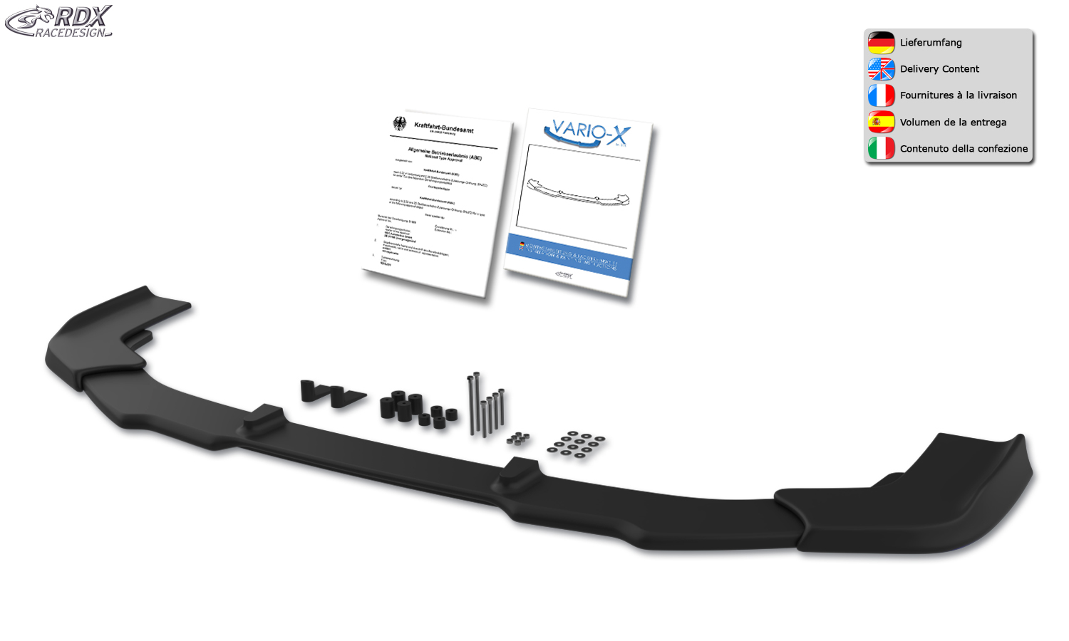 Das elegante Design des VARIO-X bewahrt die ursprüngliche Linienführung der Stoßstange und verleiht dem Fahrzeug eine tiefere, dynamische Optik. Die ABE im Lieferumfang sorgt für eine eintragungsfreie Zulassung gemäß TÜV-Vorgaben. Damit ist der Frontspoiler sofort einbaufertig und straßenzugelassen. Seine Bauhöhe beträgt 4 cm, Distanzhülsen zur individuellen Tieferlegung sind im Lieferumfang enthalten. So entsteht ein individuelles und professionelles Tuning-Ergebnis – Made in Germany.