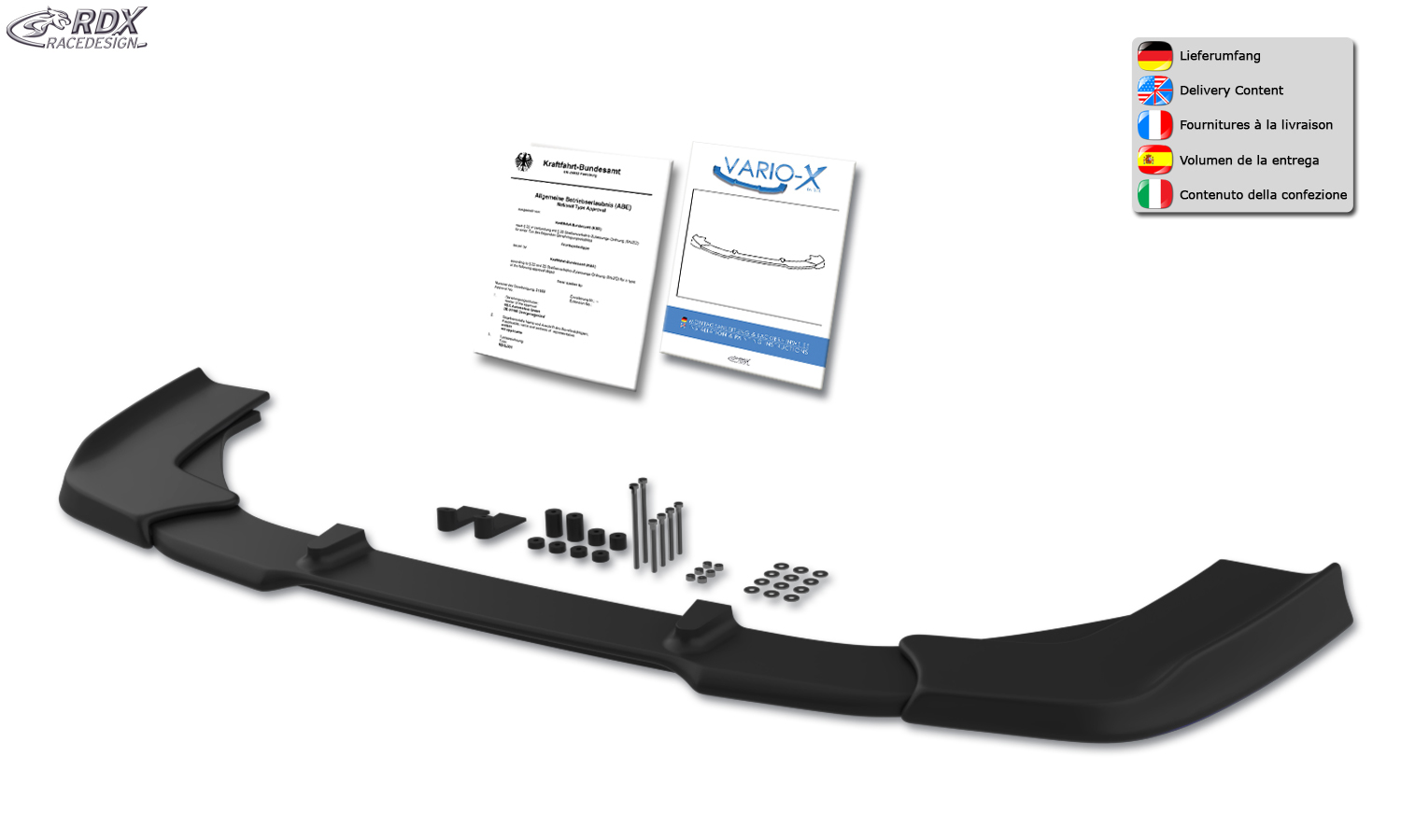 Der RDX VARIO-X Frontspoiler ist ein innovativer, 3-teiliger Frontspoiler aus hochwertigem PUR-Kunststoff (Polyurethan) und wird als 1-teilige, anbaufertige Einheit geliefert. Das Produkt wurde in Deutschland gefertigt und überzeugt durch höchste Präzision, Passgenauigkeit und bruchsicheres Material. Die Oberfläche ist lackierfreundlich und ermöglicht individuelle Farbgestaltungen, z. B. eine Kontrastlackierung zwischen Mittel- und Seitenteilen. Dank der einfachen Schraubmontage ohne Kleben wird der Frontspoiler lediglich von unten befestigt, wodurch er bei Bedarf – beispielsweise im Winter – schnell und unkompliziert demontiert werden kann. Mit einer Bauhöhe von 4 cm sorgt der VARIO-X für eine sportlich-dynamische und tiefere Optik, ohne das ursprüngliche Stoßstangendesign zu beeinträchtigen. Die ABE ist im Lieferumfang enthalten und der Frontspoiler ist somit eintragungsfrei und TÜV-geprüft.