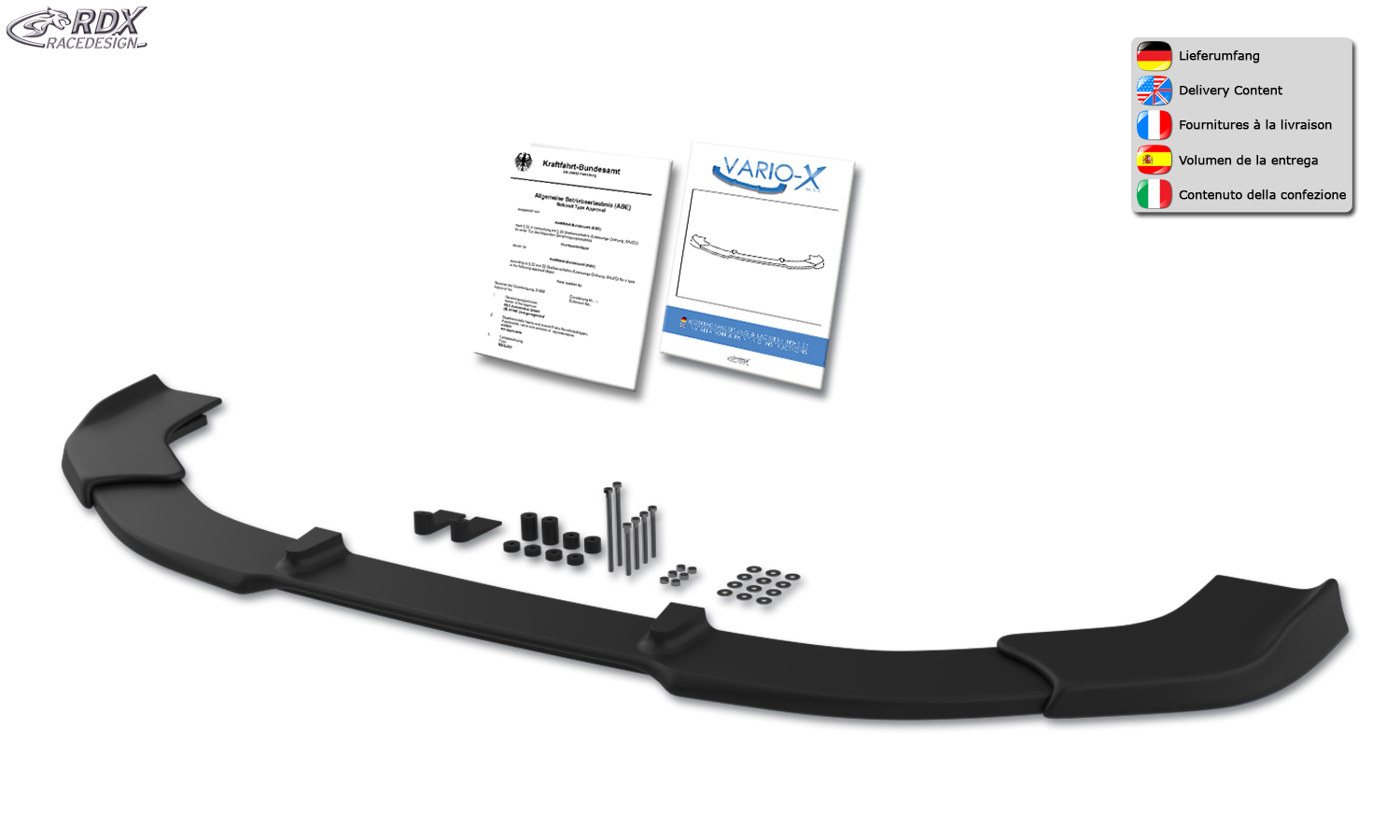 Der VARIO-X wird unlackiert in Schwarz geliefert, ist lackierfreundlich und ermöglicht individuelle Farbgestaltungen. Die modulare Bauweise mit einem Mittelteil und zwei Seitenteilen erlaubt das einfache Umsetzen kontrastreicher Farbkonzepte. Eine ABE (Allgemeine Betriebserlaubnis) sowie der komplette Anbausatz sind bereits im Lieferumfang enthalten, wodurch der Spoiler TÜV-geprüft und eintragungsfrei ist. Der VARIO-X sorgt für eine sportlich-tiefe Fahrzeugoptik, ohne das originale Design der Stoßstange zu verändern.
