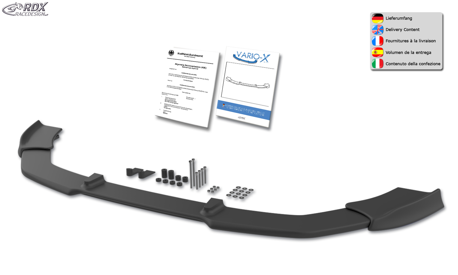 Dank der dreiteiligen Konstruktion (Mittelsegment und zwei Seitenteile) können Sie individuelle Lackierungen einfach umsetzen. Geliefert wird der Spoiler vormontiert und anbaufertig. Die Schraubmontage erfolgt unkompliziert von unten an die Stoßstange – ganz ohne Kleben. Somit lässt sich der Spoiler bei Bedarf, z. B. im Winter, blitzschnell demontieren. Der VARIO-X ist TÜV-geprüft, zugelassen und eintragungsfrei – inklusive ABE.