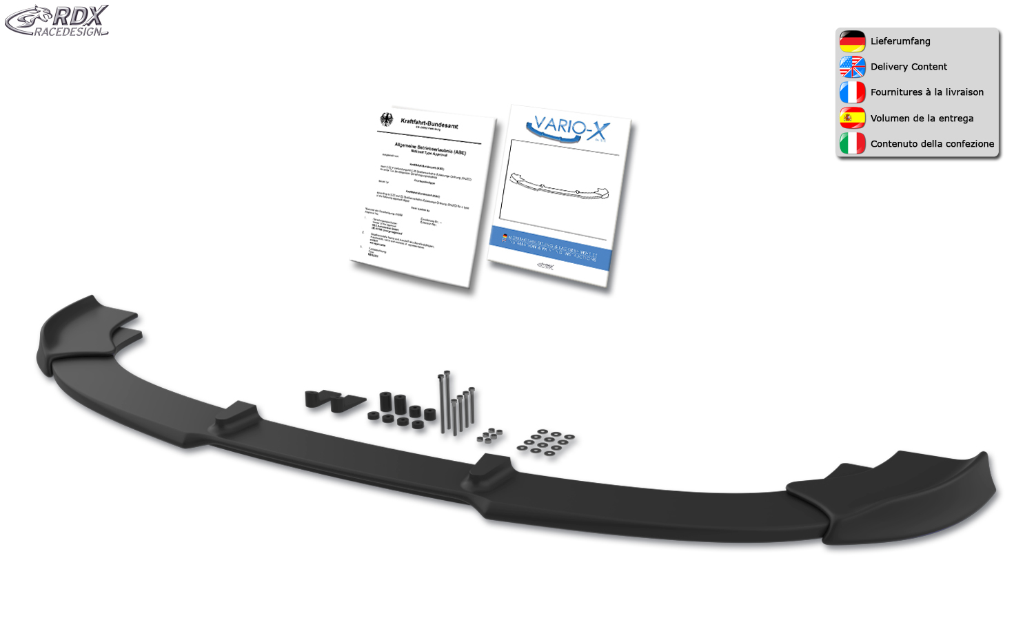 Der RDX VARIO-X Frontspoiler ist ein innovatives Aerodynamik-Bauteil, das Ihrem Fahrzeug einen sportlich-dynamischen Look verleiht. Durch seinen 3-teiligen Aufbau aus hochwertigem PUR-Kunststoff (Polyurethan) überzeugt der Frontspoiler durch hohe Bruchsicherheit und exakte Passgenauigkeit. Die Herstellung in Deutschland gewährleistet beste Qualität und Langlebigkeit. Dank der präzisen Fertigung gelingt die Montage besonders einfach – der Spoiler wird lediglich von unten verschraubt, ganz ohne Kleben oder sichtbare Befestigungselemente. Zudem bleibt das originale Design der Stoßstange vollständig erhalten, während die Front optisch tiefer und aggressiver wirkt.