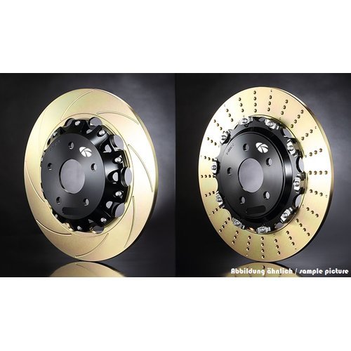 - Belüftete, geschlitzte und schwimmend gelagerte zweiteilige Bremsscheiben