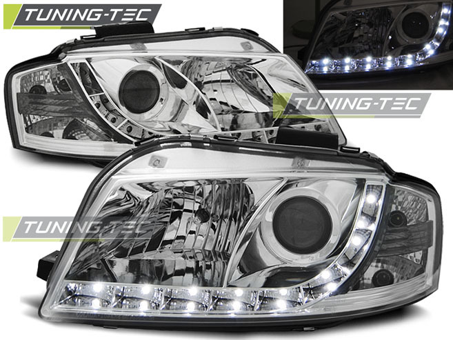 Die chromfarbenen Projektorscheinwerfer mit LED-Standlicht bieten eine moderne und stilvolle Aufwertung Ihres Fahrzeugs. Durch das integrierte Tageslicht-Design und die präzise Verarbeitung sorgen diese Scheinwerfer für eine verbesserte Ausleuchtung der Fahrbahn und ein markantes Erscheinungsbild. Das Set umfasst linkes und rechtes Scheinwerfergehäuse und ist zu 100 % neu.