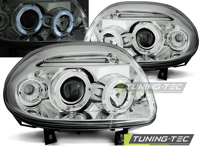 Die Angel Eyes Scheinwerfer in Chrom-Optik verleihen Ihrem Fahrzeug eine auffällige und moderne Lichtsignatur. Das Set besteht aus zwei hochwertigen Projektorscheinwerfern mit Angel Eyes–Standlicht und ist speziell passend für Renault Clio II (09/1998–05/2001) entwickelt. Dank der integrierten Projektortechnik profitieren Sie von einer verbesserten Lichtausbeute und einem klar definierten Lichtkegel. Die Scheinwerfer sind mit E-Prüfzeichen versehen, wodurch keine zusätzliche Eintragung erforderlich ist. Abblend- und Fernlicht werden jeweils über H1-Leuchtmittel realisiert, die im Lieferumfang bereits enthalten sind. Die elektrische Leuchtweitenregulierung wird unterstützt, jedoch ist der Stellmotor separat zu übernehmen.