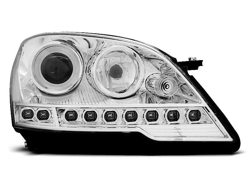 Die hochwertigen Projektorscheinwerfer mit LED-Tageslichtfunktion in Chrom-Ausführung verleihen Ihrem Fahrzeug ein modernes Erscheinungsbild und verbessern die Sichtbarkeit im Straßenverkehr. Die Kombination aus LED-Standlicht und Projektortechnik sorgt für eine klare Lichtverteilung und ein unverwechselbares Design. Dank der elektrischen Leuchtweitenregulierung mit integriertem Stellmotor lassen sich die Scheinwerfer präzise einstellen. Diese Scheinwerfer sind direkt anschlussfertig und mit einer E-Prüfnummer versehen, wodurch keine zusätzliche Eintragung erforderlich ist. Das Set enthält beide Seiten (links und rechts) und eignet sich ideal zum Austausch oder zur optischen Aufwertung Ihrer Beleuchtung – passend für Mercedes W164 M-Klasse ab Baujahr 2008.