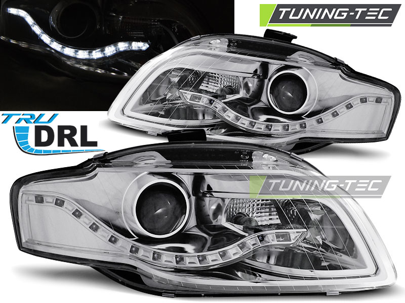 Die True DRL Chrom Scheinwerfer überzeugen durch moderne LED-Technologie und ein markantes Design. Sie sind speziell passend für den Audi A4 B7 entwickelt und bieten eine perfekte Kombination aus sportlicher Optik und verbesserter Lichtleistung. Dank der integrierten Projektor-Technik und LED-Tagfahrlicht (DRL) profitieren Sie von einer klaren, hellen Ausleuchtung der Straße bei Tag und Nacht. Die Scheinwerfer sind mit E9- und ECE-R87-Zulassung versehen, wodurch keine zusätzliche Eintragung erforderlich ist. Das Set besteht aus einem linken und rechten Scheinwerfer, inklusive H9-Leuchtmittel für Abblend- und Fernlicht sowie elektrischer Leuchtweitenregulierung mit eingebautem Stellmotor.