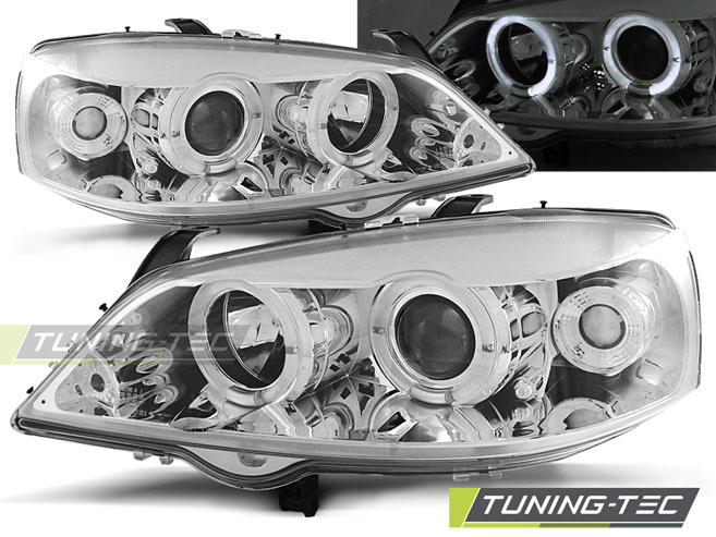 Diese hochwertigen Projektorscheinwerfer mit zwei Angel Eyes verleihen Ihrem Fahrzeug eine sportlich-edle Optik und sorgen gleichzeitig für optimale Lichtausbeute. Das Set umfasst den linken und rechten Scheinwerfer in elegantem Chrom-Design.