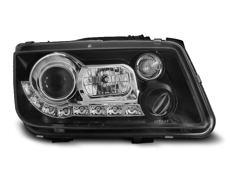 Diese schwarzen Projektorscheinwerfer mit LED-Tagfahrlicht verleihen Ihrem Fahrzeug einen modernen, sportlichen Look und sorgen gleichzeitig für optimale Ausleuchtung der Straße. Das Set enthält beide Seiten – links und rechts – und ist fahrzeugspezifisch passend für VW Bora Modelle von 09/1998 bis 05/2005. Durch das integrierte LED-Standlicht und die klare Projektorlinse wird das Licht homogen verteilt und die Sichtbarkeit deutlich verbessert. Die Scheinwerfer sind mit einem E-Prüfzeichen versehen und somit eintragungsfrei für den Straßenverkehr zugelassen. Die elektrische Leuchtweitenregulierung kann übernommen werden, der Stellmotor ist jedoch nicht im Lieferumfang enthalten.