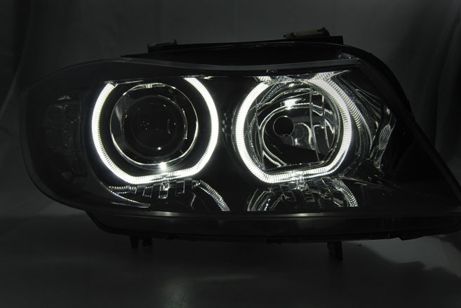 Die Angel Eyes LED Scheinwerfer in Schwarz bieten eine moderne Optik und verbesserte Lichtleistung passend für BMW E90 und E91. Dank der integrierten LED-Blinker und Halo-Ringe erhalten Sie eine sportliche Frontansicht mit deutlich erhöhter Sichtbarkeit im Straßenverkehr. Die hochwertige Verarbeitung und das E-Zeichen sorgen für eine einfache Zulassung im öffentlichen Straßenverkehr. Diese Projektorscheinwerfer werden im Set für links und rechts geliefert und verfügen über eine elektrische Leuchtweitenregulierung. Das Umschalten zwischen Links- und Rechtslenkerbetrieb ist möglich, wodurch die Scheinwerfer vielseitig einsetzbar sind.