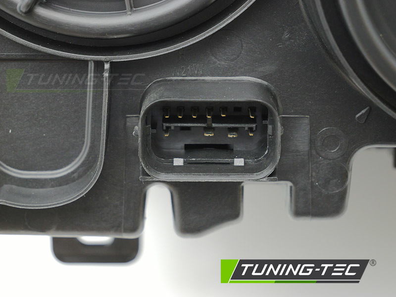 Der Scheinwerfer verfügt über eine elektrische Leuchtweitenregulierung mit integriertem Stellmotor und unterstützt Tagfahrlicht (W21W), Standlicht (W5W) sowie Blinkerlampe (PY21W). Abblend- und Fernlicht werden mit H7-Lampen betrieben (nicht im Lieferumfang enthalten).