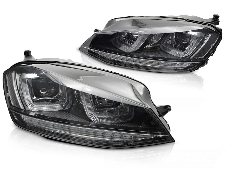 Standlicht und Tagfahrlicht sind im LED U-Typ ausgeführt, was eine gleichmäßige und helle Ausleuchtung garantiert. Das Abblendlicht nutzt H7-Leuchtmittel (nicht im Lieferumfang enthalten), während das Fernlicht mit H1 betrieben wird (nicht enthalten). Die Leuchtweitenregulierung erfolgt elektrisch – der Stellmotor ist bereits integriert. Der Scheinwerfer wird als Paar für die linke und rechte Seite geliefert.
