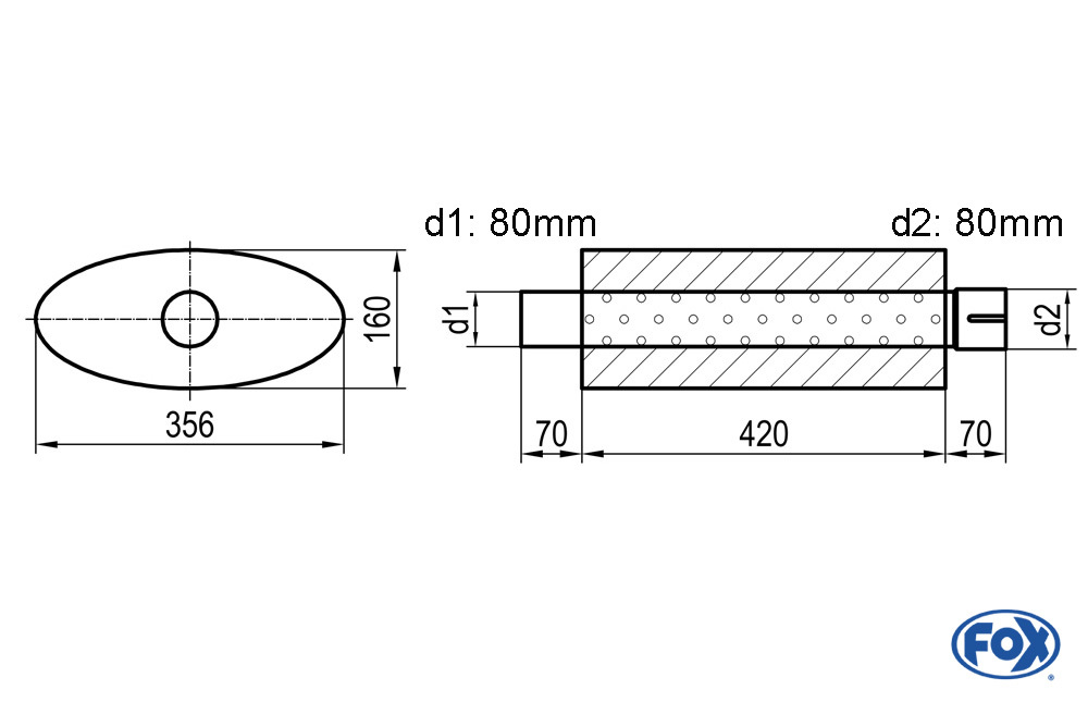 Produktinformationen "FOX Uni-Schalldämpfer oval Edelstahl 356x160mm, d1Ø 80mm, d2Ø 80mm, Länge 420mm"
