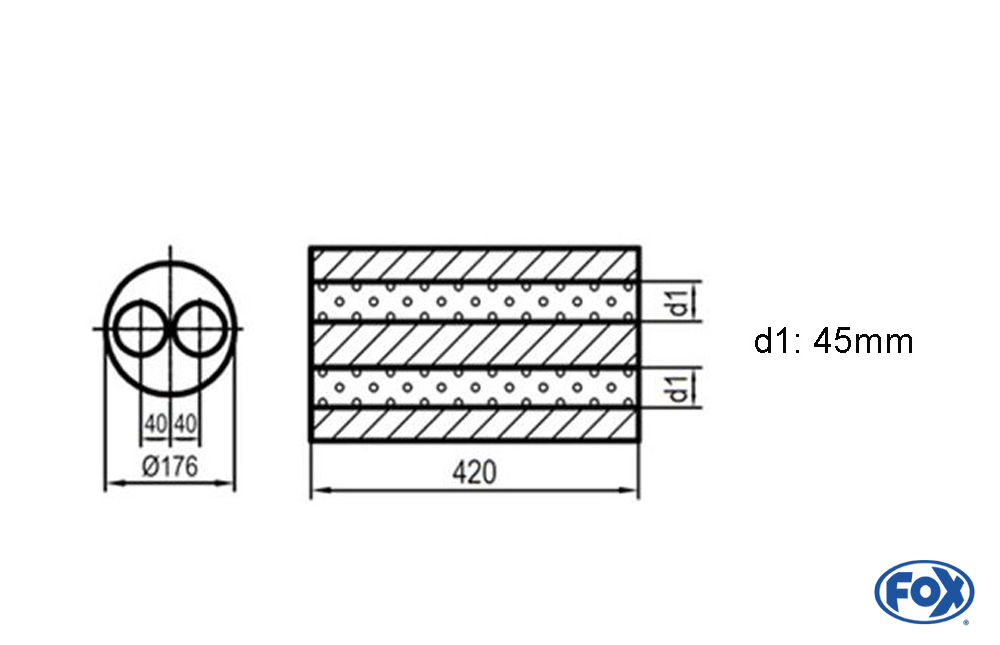Der FOX Uni-Schalldämpfer rund aus hochwertigem Edelstahl überzeugt durch präzise Verarbeitung und flexible Einsatzmöglichkeiten. Mit einem Durchmesser von Ø176mm, einer Länge von 420mm und einer zweiflutig ausgeführten Abwicklung bietet dieser Schalldämpfer optimale Voraussetzungen für den individuellen Auspuffbau. Der Anschlussdurchmesser d1 beträgt Ø45mm. Die angegebenen Maße und Aufbauarten entsprechen unserem Standardprogramm. Auf Wunsch kann der Dämpfer auch nach individuellen Maßvorgaben oder anhand einer technischen Skizze gefertigt werden – ideal, wenn Sie eine maßgeschneiderte Lösung benötigen. Für ein persönliches Angebot kontaktieren Sie uns einfach per Produktanfrage oder per E-Mail an info@fox-sportauspuff.de.