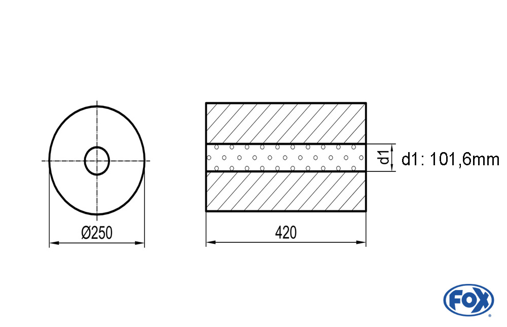 - 1x FOX Uni-Schalldämpfer rund ohne Stutzen (Ø250 mm, Länge 420 mm, d1 101,6 mm)