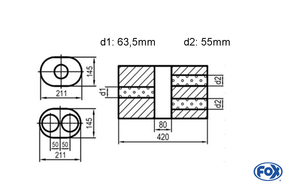 Der FOX Uni-Schalldämpfer oval zweiflutig mit Kammer besteht aus hochwertigem Edelstahl und bietet eine langlebige, korrosionsbeständige Lösung für den universellen Einsatz im Abgasanlagenbau. Mit Abmessungen von 211x145mm, einem Einlassdurchmesser (d1) von 63,5mm und einem Auslassdurchmesser (d2) von 55mm sowie einer Gesamtlänge von 420mm ist dieser Schalldämpfer sowohl funktional als auch anpassbar. Auf Wunsch kann der Schalldämpfer auch in anderen Längen oder nach individueller Skizze gefertigt werden, sofern dies technisch realisierbar ist. Für Sonderanfertigungen können Sie uns einfach per Produktanfrage oder per E-Mail an info@fox-sportauspuff.de kontaktieren.