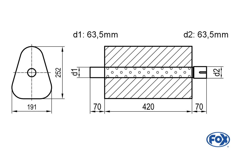 Der FOX Uni-Schalldämpfer mit dreieckiger Bauform aus hochwertigem Edelstahl ist die ideale Lösung, wenn Sie einen universellen, robusten und klangstarken Ersatz oder eine individuelle Anpassung Ihrer Abgasanlage suchen. Mit einer Abwicklung von 725mm, einer Länge von 420mm sowie Anschlussdurchmessern von d1 Ø 63,5mm außen und d2 Ø 63,5mm innen bietet dieser Schalldämpfer flexible Einsatzmöglichkeiten und überzeugt durch präzise Verarbeitung. Auf Wunsch kann der Dämpfer auch in einer individuellen Länge oder nach persönlicher Skizze gefertigt werden – kontaktieren Sie uns einfach per Anfrage oder E-Mail an info@fox-sportauspuff.de.