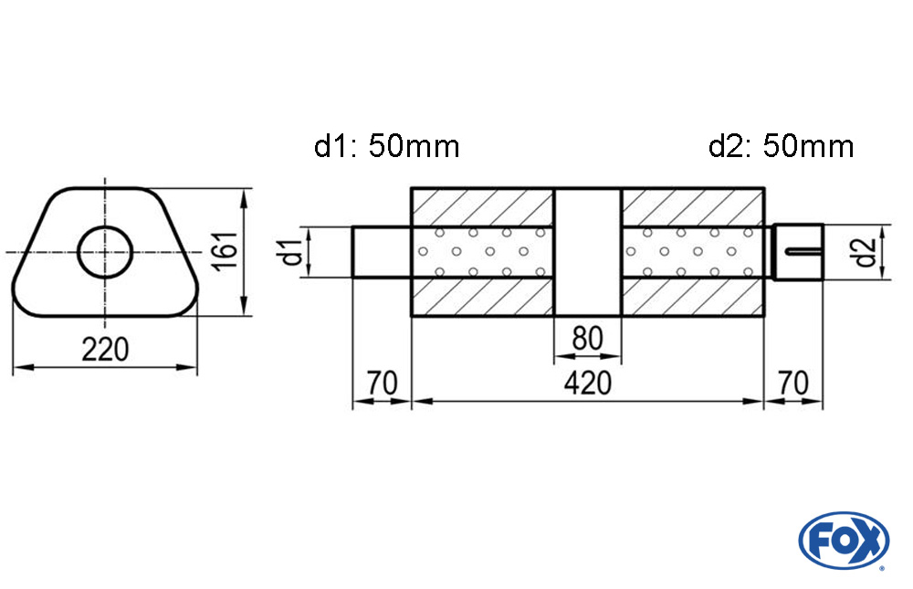 - 1x FOX Uni-Schalldämpfer trapez mit Kammer + Stutzen (Abw. 644, Länge 420 mm, Ø 50 mm außen/innen)