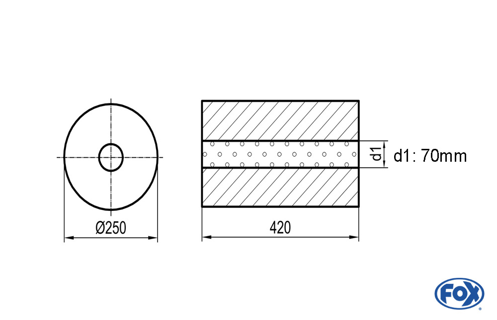 - 1x FOX Uni-Schalldämpfer rund ohne Stutzen (Ø250 mm, d1 70 mm, Länge 420 mm)
